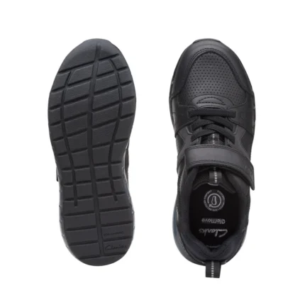 Taking its lead from the natural shape of the foot, this style from Clarks enhances movement – making it perfect for school days. The sports-inspired design is combined with heel and toe protection to guard against scuffs, whilst the sole is flexible and lightweight. The result? All-day protection and comfort. This shoe is finished with a hygienic lining that keeps feet fresh and odour-free all day long. Available in whole and half sizes and different widths. Upper Material Leather. Lining Material Textile. Sole Material Rubber. Fastening Type Riptape