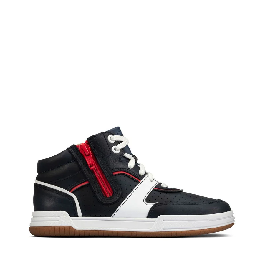 Giving adventurous kids exactly what they need to explore, Fawn Peak from Clarks is an innovative high-top sneaker equipped with the necessary elements to support the healthy development of little feet. Kids will love the lightweight freedom of airy, grip-enhanced EVA soles, with targeted grooves that bend and flex with their natural foot motion. Responsibly sourced navy leather and recycled linings give breathable all-day comfort, and padding around the ankle and an Eco Remix footbed add cushioning where it matters. Finished with laces and double zips that guarantee a great fit and make shoes easy to get on and off in a jiffy. UPPER MATERIAL Leather. LINING MATERIAL Leather. SOLE MATERIAL Rubber. FASTENING TYPE Lace and Zip. REMOVABLE INSOLE No