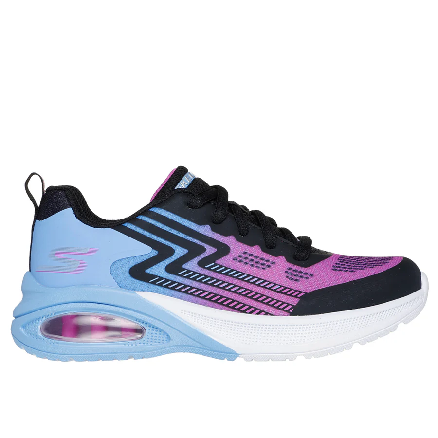 The Skechers 303617L Girls Trainer-Periwinkle combines mesh textile uppers with synthetic overlays for added support. Its stylish blue and purple ombre design with black accents and bubble heel make it a perfect choice for active girls. This trainer is fastened with laces for a secure fit and features a cushioned footbed lined with textile.