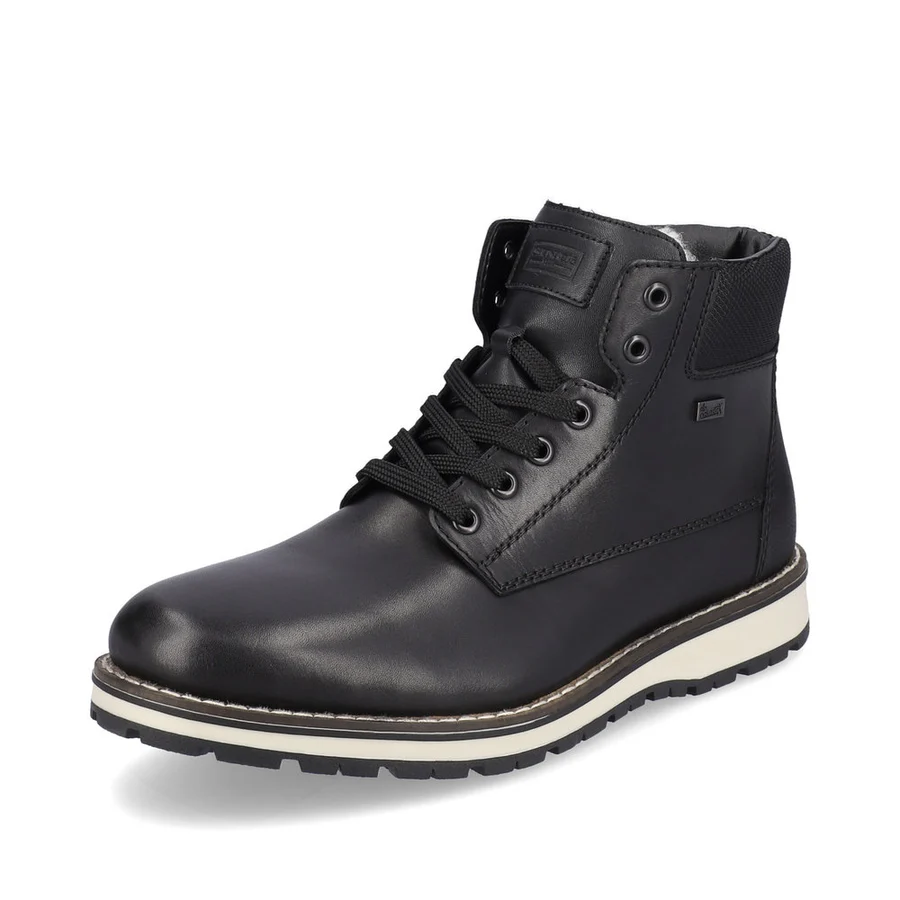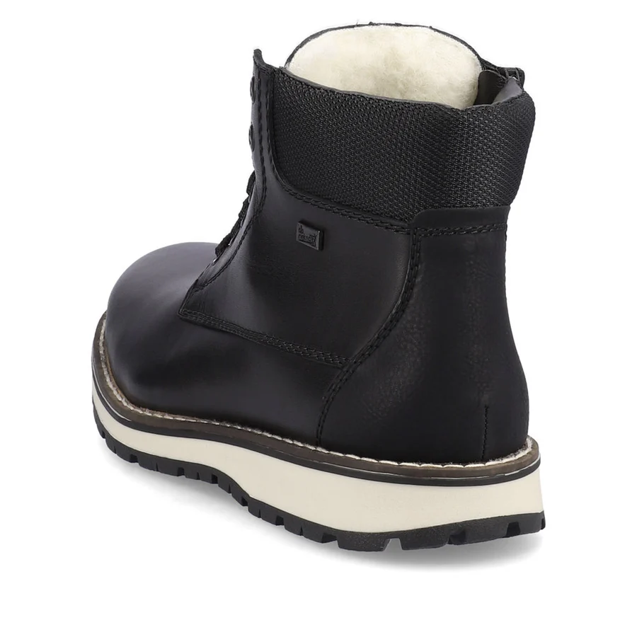 These classic wide fit mens leather boots from Rieker come with fine stitch detailing along with a contrasting white sole. The laces and full inner zip ensure a good fit while the wool lining and water resistant TEX lining will keep you cosy and dry in the Autumn/Winter months. Uppers: Leather/Manmade. Lining: Lambswool. Sole: Manmade.