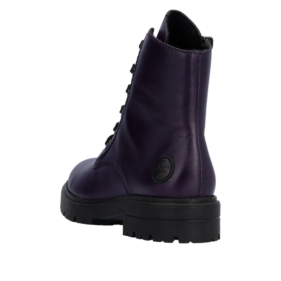 Enhance your style with these sleek aubergine-colored Rieker Z2841 biker boots. Made with smooth leather, they provide both comfort and functionality with their lacing and zipper. Featuring a grippy, block heel sole and extra soft cover sole, these boots are perfect for any occasion.